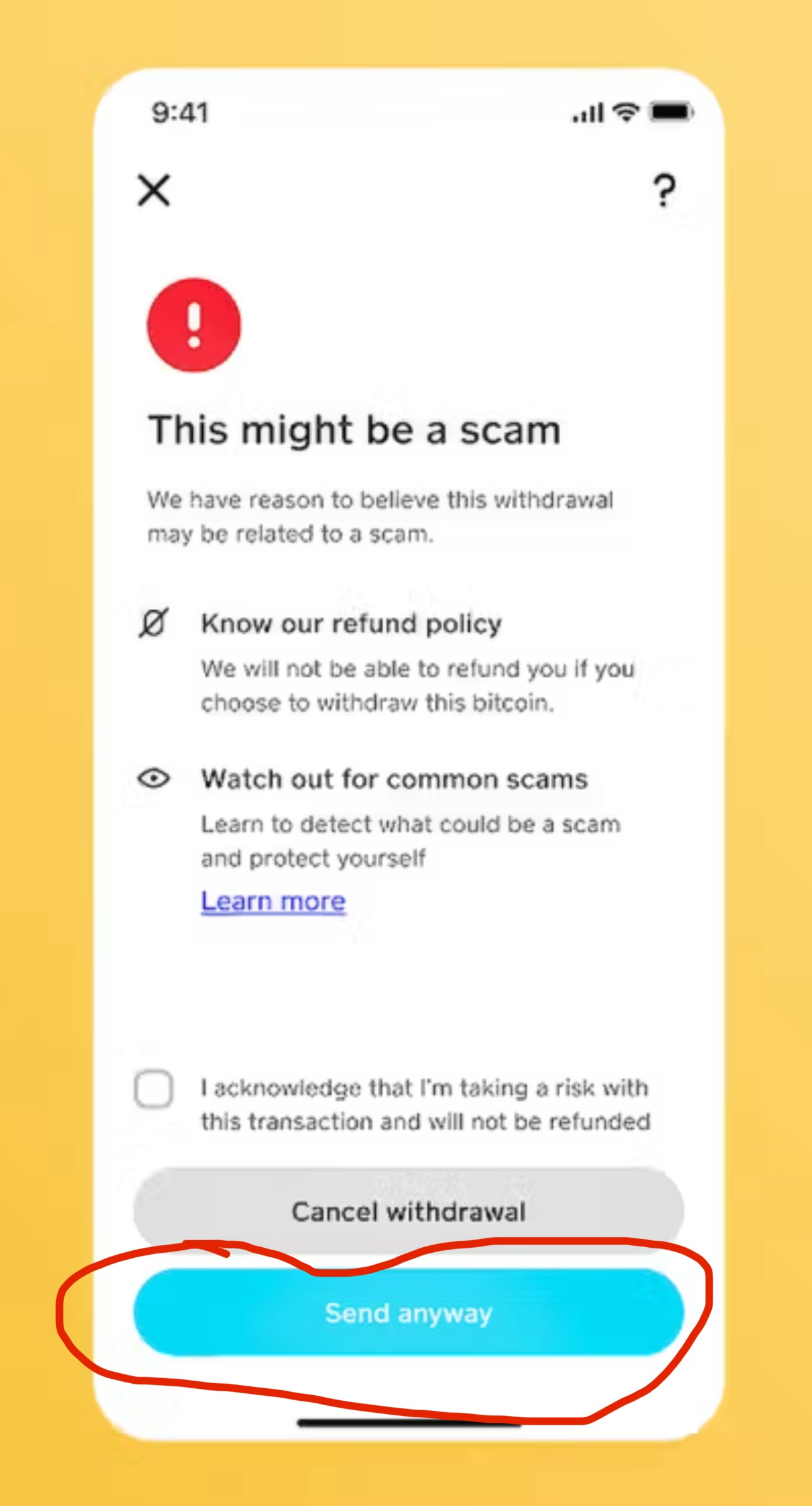 f it’s your first time paying us and it’s in bitcoin cash app may give you a warning or cancel your payment. Don’t be alarmed. If you come across this warning log out of your account, re-log in and then re-submit payment and select send anyway.