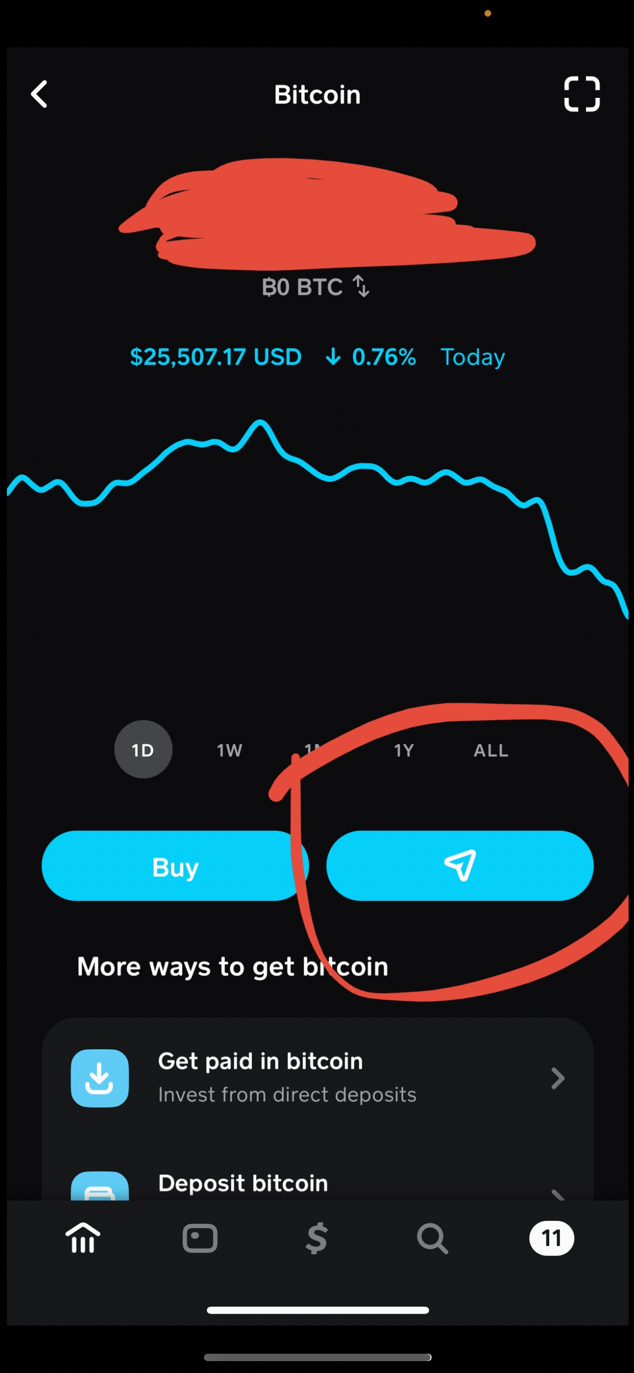 After purchasing the needed amount of bitcoin, select the paper plane arrow to send.